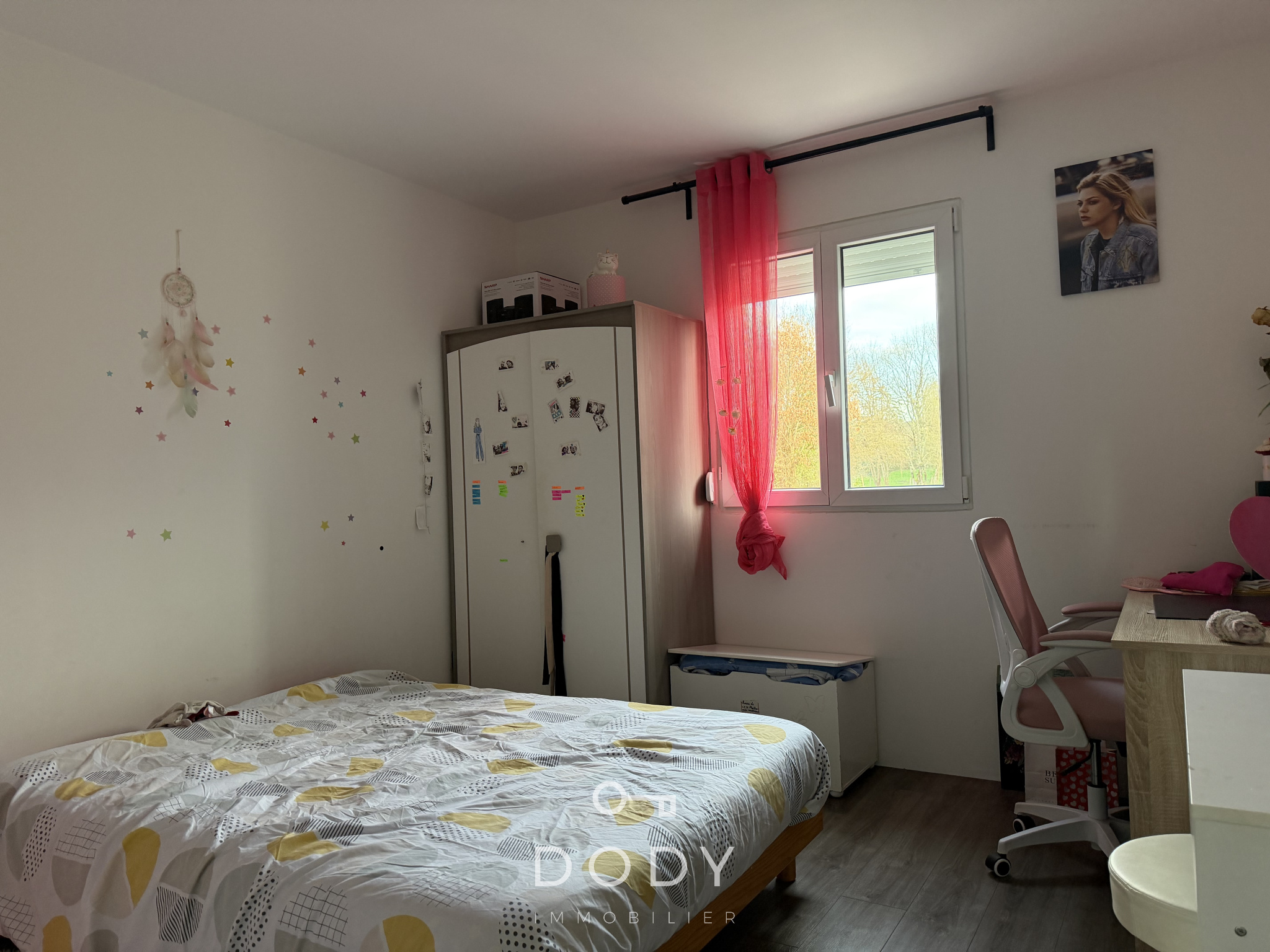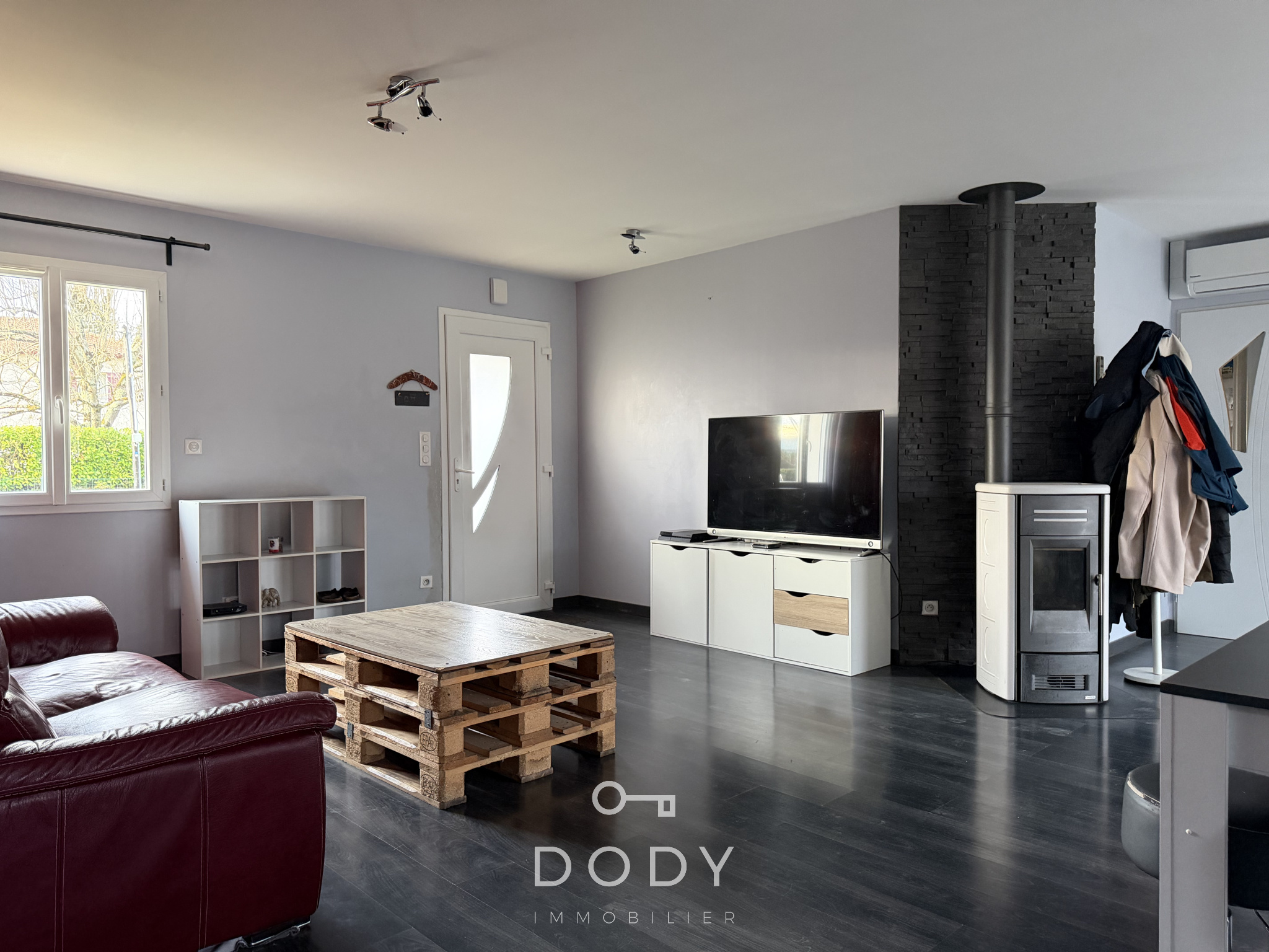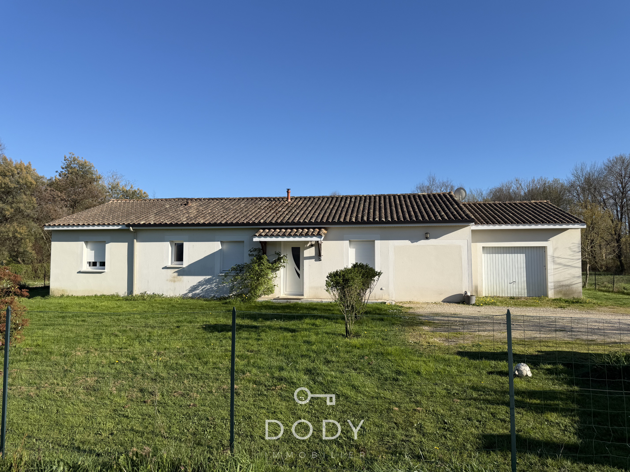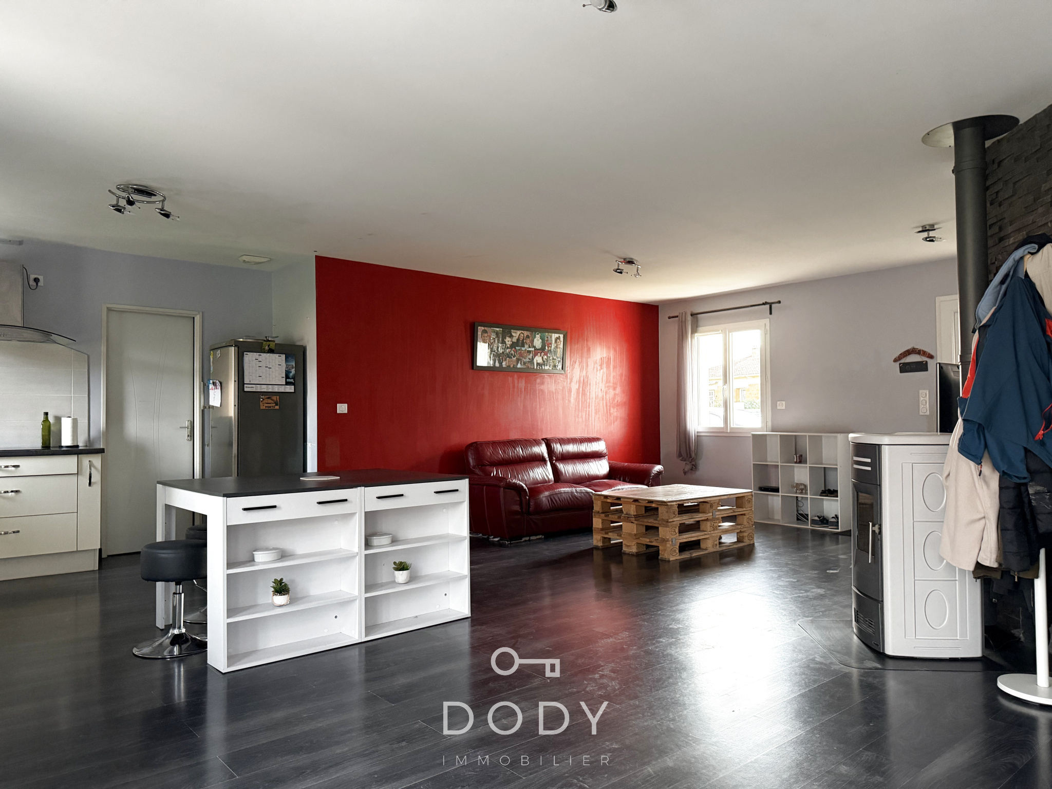 DODY immobilier vous invite à découvrir cette maison de plain-pied d'environ 120 m² habitables alliant espace et sérénité. Elle se compose d'une cuisine aménagée ouverte sur le salon séjour équipée d'un poêle à granulé, une buanderie, un wc, un bureau, 4 chambres, une grande sale d'eau avec un wc. Un garage. Le tout implantée sur un jardin clos d'environ 1600 m².