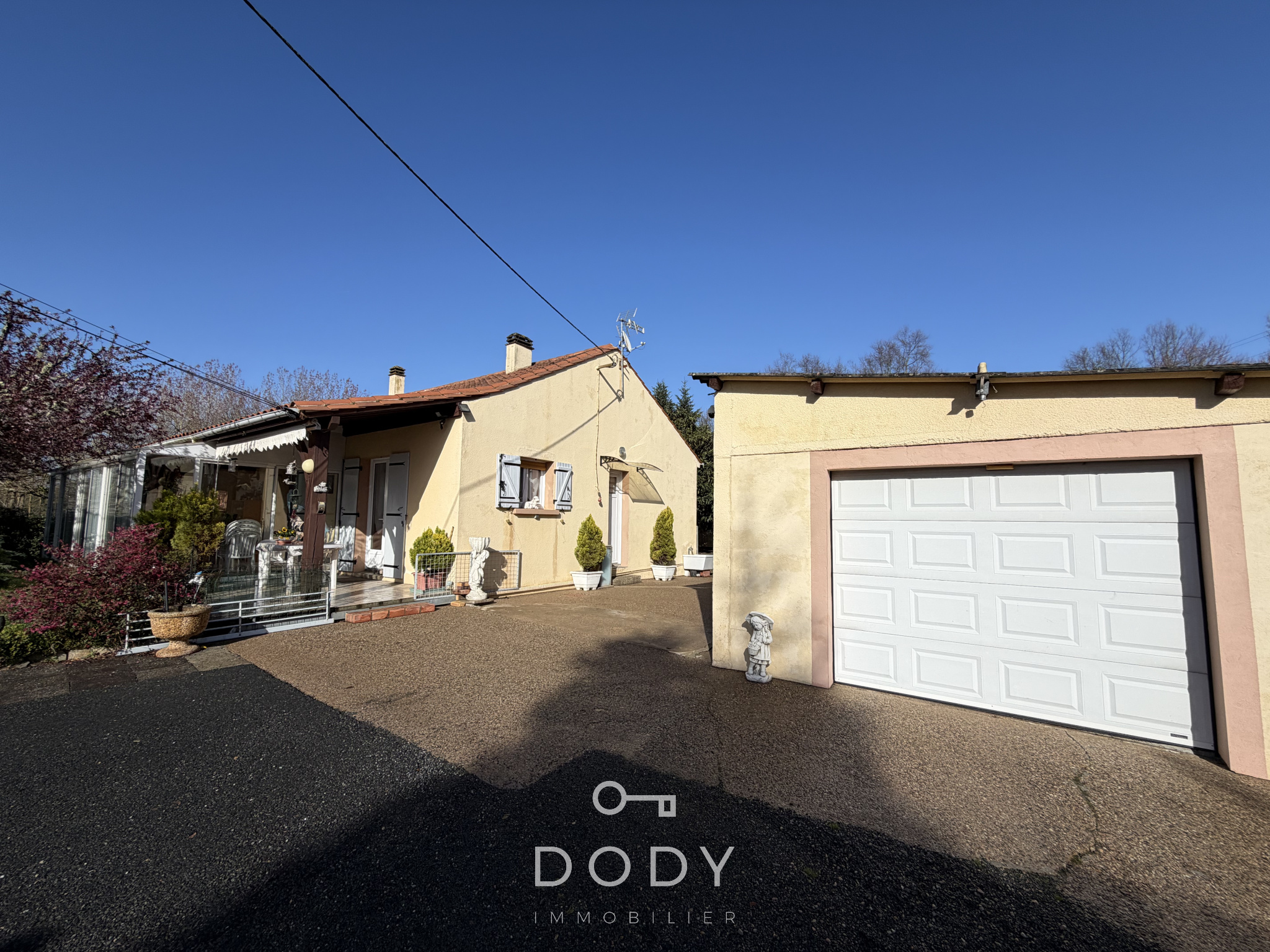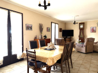 Agréable maison de plain-pied d'environ 92 m² habitables, composée d'une cuisine aménagée, un salon séjour donnant sur une véranda, trois chambres, un wc, une salle de bains et de nombreux rangements. Un garage avec ateliers et un hangar de plus de 110 m². Jardin clos et arboré de 2 500 m².